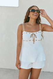 A basic SABO signature set with feminine detailing! TheΒ Indigo Top is made from a natural ribbed woven cotton fabric in white. It features contrast tan wide adjustable straps, threaded draw tie detail at neckline and under bust and flouncy a-line hem. Get the set with the Indigo Shorts. Designed exclusively by Sabo.