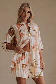 The perfect set to throw over your bikinis and head straight to lunch in! TheΒ Lani Shorts are made from a high quality viscose linen blend fabric with our exclusive Island Time print. They are a high waisted style featuring a thin elastic waist with drawstring, gathered flouncy panel and high-low hems. Get the look with the Lani Top! Designed exclusively by Sabo.
